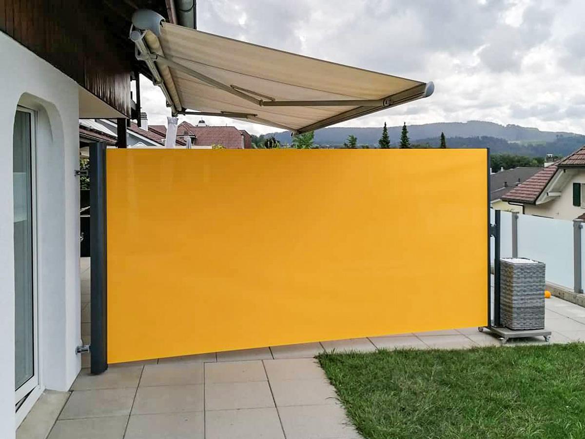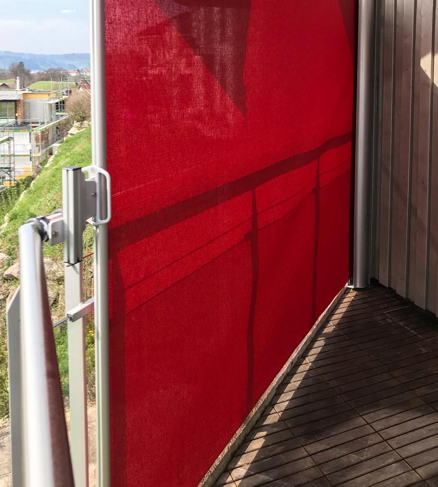 Einfach das Gewebe horizontal mit dem Griff aus dem befestigten Markisenkasten ziehen und im gegenüber montierten Griffhalter einhängen.